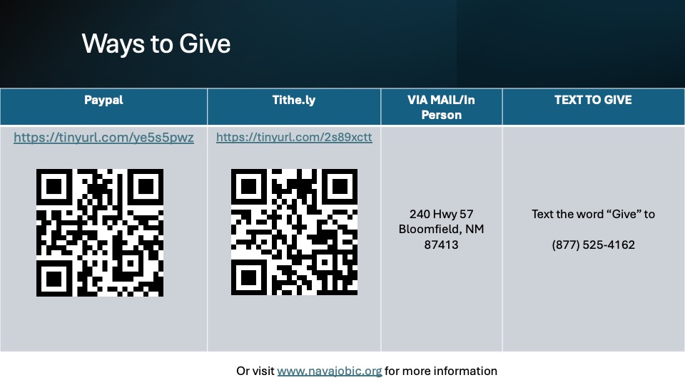 If you would like to support the Mission in any way, you can visit the Mission’s website at www.navajobic.org or scan the QR codes below.